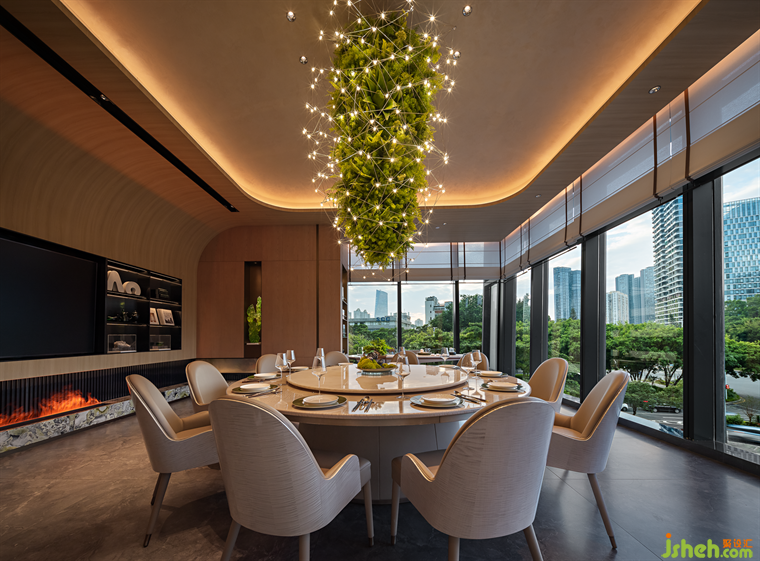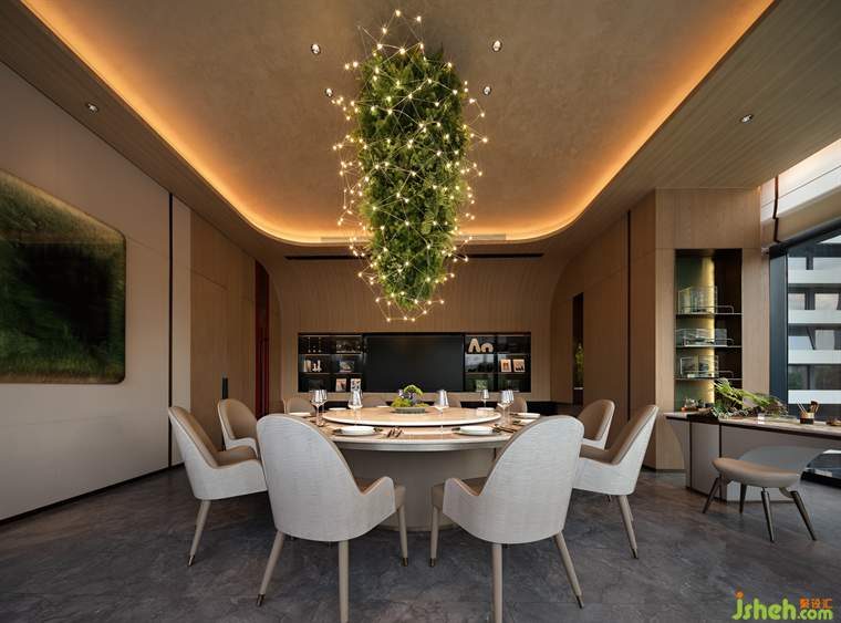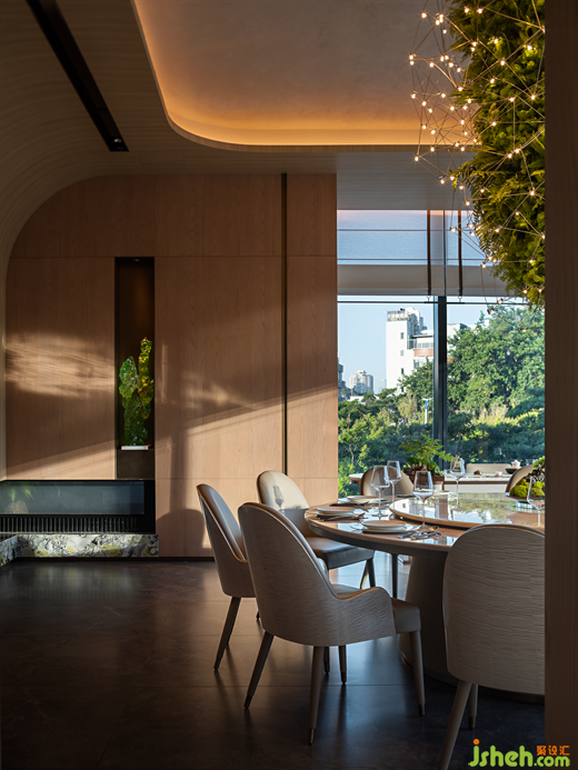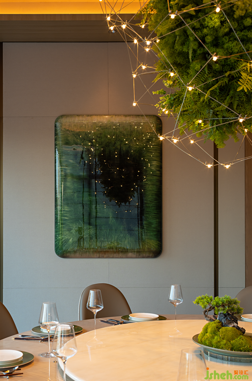 郁郁青春,草木輝發(fā),花下秉燭,春夜宴飲,故名“望春酌”。潮菜餐廳設(shè)計(jì)師將自然草木形態(tài)引入空間肌理之中,花木從石材和原木從抽枝延伸,蒙絡(luò)著瑩瑩燈火,將春夜詩(shī)景徐徐鋪展于眼前,盡顯自然野趣。Lush youth, grass and trees, flowers and candles, spring night banquet, so the name "looking at the spring drink". The designer introduces natural grass and trees into the texture of the space, flowers and trees from the stone and logs from the extension of the branches, covered with glittering lights, the spring night poetic scene slowly spread in front of us, showing the natural interest of the wild.