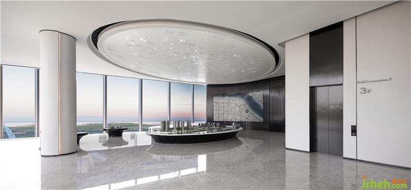 設(shè)計師以建筑自有的弧面形態(tài)和通透玻璃界面,將引景入室作為設(shè)計的切入點,以不動聲色之美學(xué),收納人杰地靈的自然之饋贈。售樓處設(shè)計