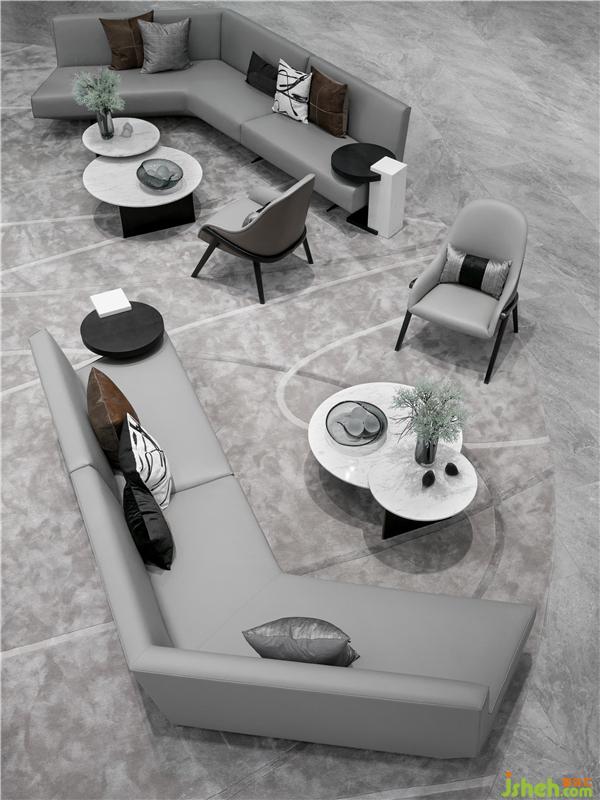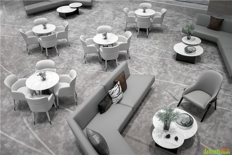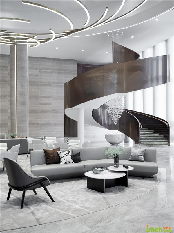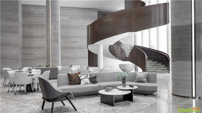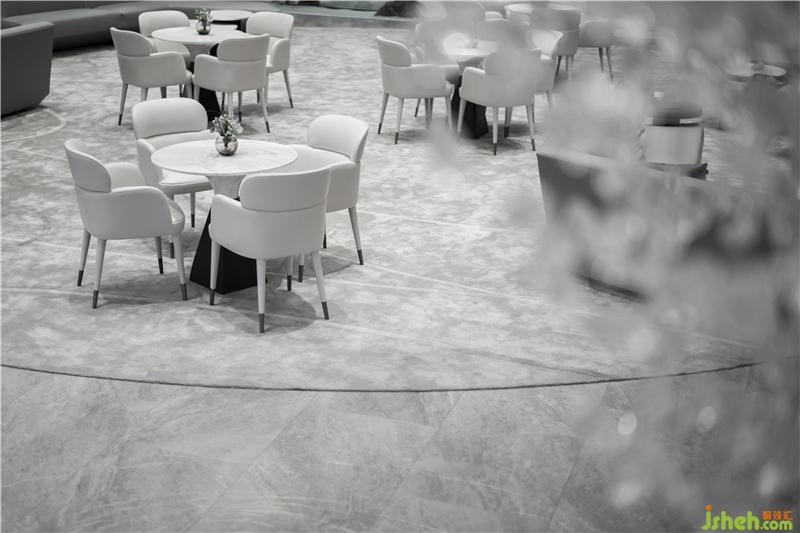 曲線的曼妙在于起伏宛轉(zhuǎn),在于呼吸流暢,亦在于如山如水的浩渺情味。兩層挑高的洽談區(qū)中,曲線作為重要的視覺線索貫穿于多個(gè)空間層面,打破了橫平豎直的方正對(duì)稱,取而代之的是一幅通透變化的形意畫卷:仰觀波紋斷續(xù)如聚,俯察水墨如漫如浸,俯仰之間生息流動(dòng)。往細(xì)處推敲,座椅的扶手、靠背、茶幾桌面的弧線,俱是曲線一以貫之的起承轉(zhuǎn)合。