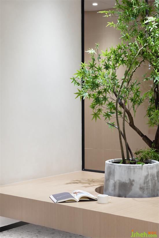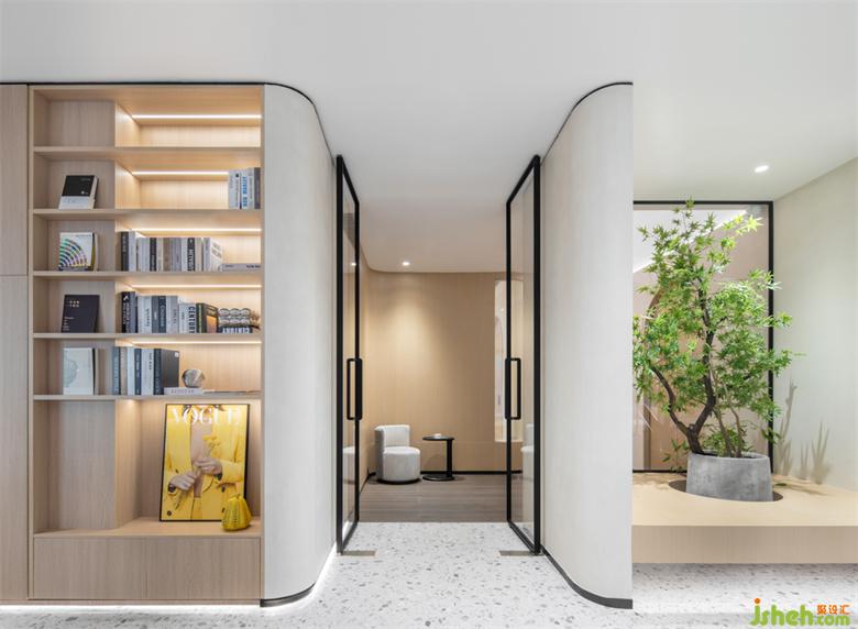 動(dòng)線的節(jié)奏與韻律激發(fā)起美感的無限聯(lián)想,通道的內(nèi)外銜接順延餐廳與辦公空間。珠寶展廳設(shè)計(jì)木質(zhì)材料包裹出溫潤寧靜之感,連通墻面的木藝隔層,被布置為一處溫馨的閱讀區(qū)域,向內(nèi)里探索,串聯(lián)起一條多維度的空間故事線。