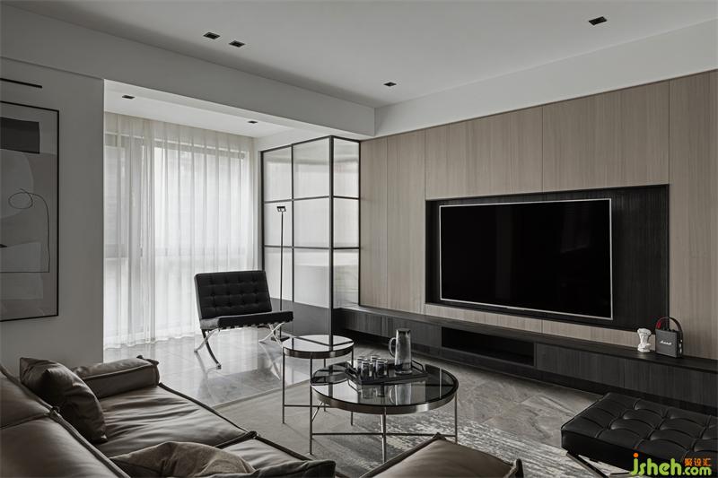 5.生活陽(yáng)臺(tái)移入客廳陽(yáng)臺(tái)原本凹進(jìn)去位置,完善清潔功能;加上長(zhǎng)虹玻璃門(mén)的設(shè)計(jì)又拓寬了電視墻的視野。
