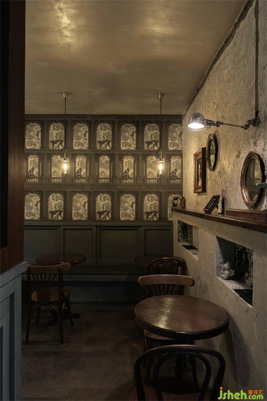 情緒:整體咖啡館設(shè)計采用大面積的中性咖啡及咖啡氣泡的顏色、以及深色漆面運用,讓進入空間的人靜下來,沉浸進去,做舊銅燈照射的燈光,微微給人微醺的感受,鐵藝藝術(shù)玻璃透過燈光,給人夢幻的想象場景。空間中仿佛罩了一層濾鏡,從而營造情緒化空間氛圍。