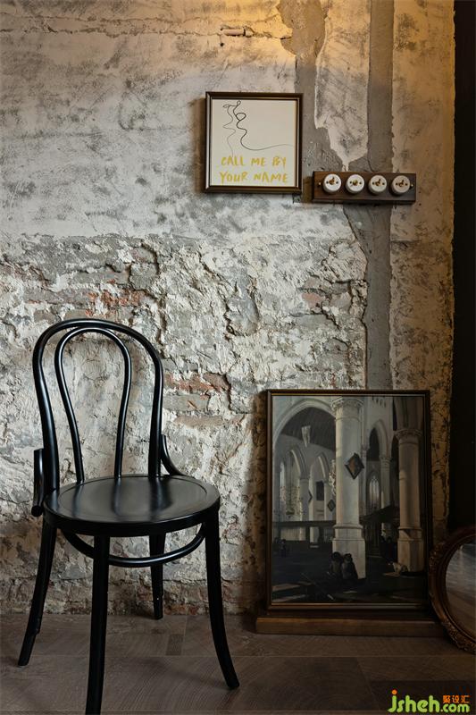 現(xiàn)材:將原墻面,以看似隨意而藝術(shù)的方式鑿毛墻面的處理,原店鋪剩下的老木頭拆除時已破損,就地取材,將就原來的質(zhì)感保留下來,以至于空間隨性、包容的空間感受。