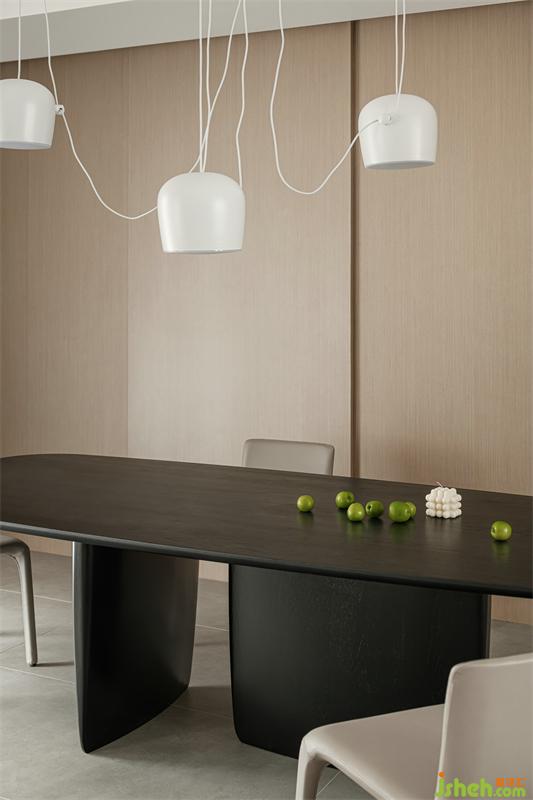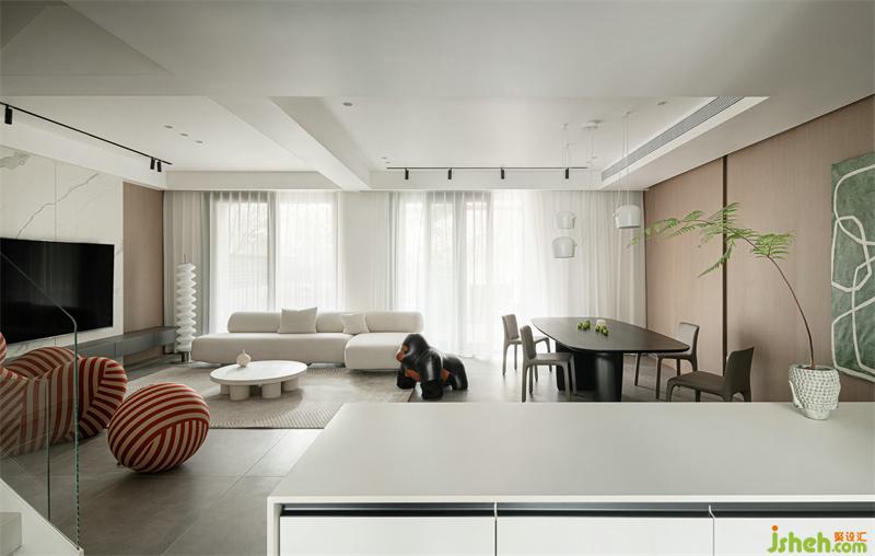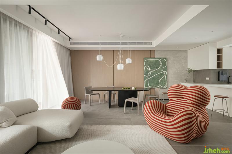 The dining room and the living room are connected together, and the top surface and the ground are also integrated to make the whole space look more integrated and spacious. You can also follow the drama while eating in the restaurant.