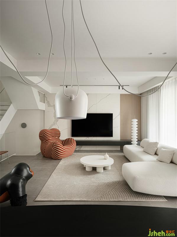電視背景墻材質(zhì)采用巖板與木飾,質(zhì)感又柔和。創(chuàng)造了不一樣的空間立面形態(tài)。復(fù)式設(shè)計(jì)多動(dòng)線設(shè)計(jì)讓客廳與餐廳連貫且獨(dú)立,增加空間互動(dòng)又讓空間更加寬敞。媽媽的懷抱和猩猩凳滿足功能需求的同時(shí)增加生活情調(diào)。