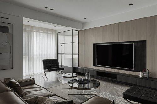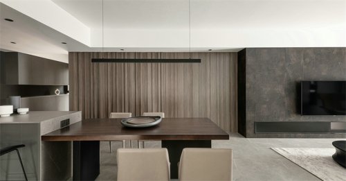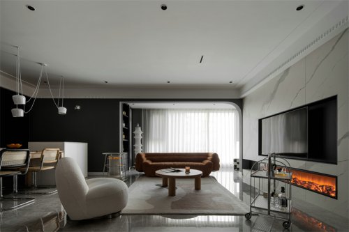 The TV background wall is made of slate and wood, with a soft texture. Created a different spatial fa?ade form. The multi-moving line design makes the living room and dining room coherent and independent, increasing the space interaction and making the space more spacious. The mother's arms and the orangutan stool meet the functional needs and increase the mood of life.