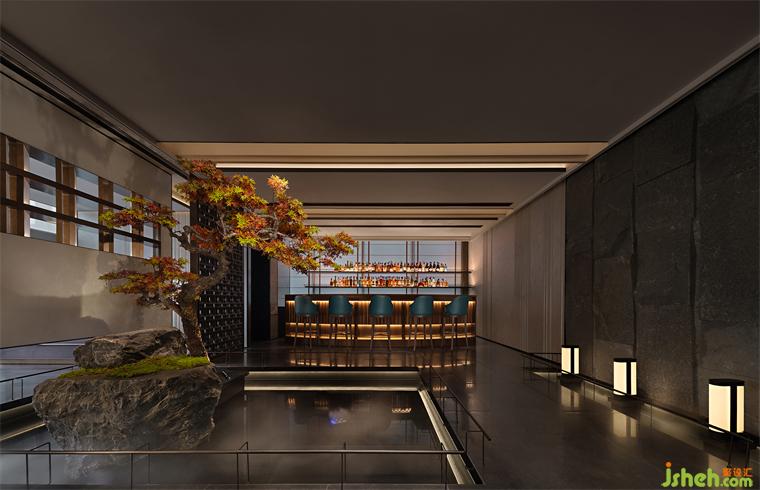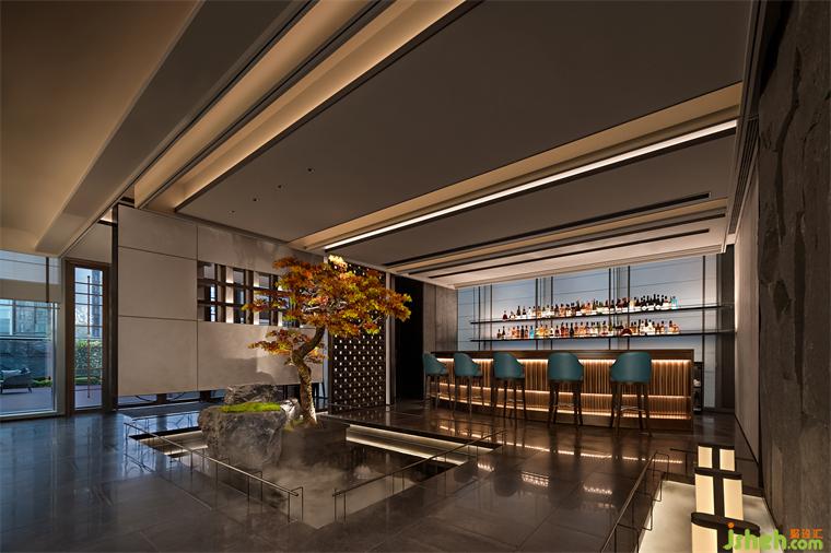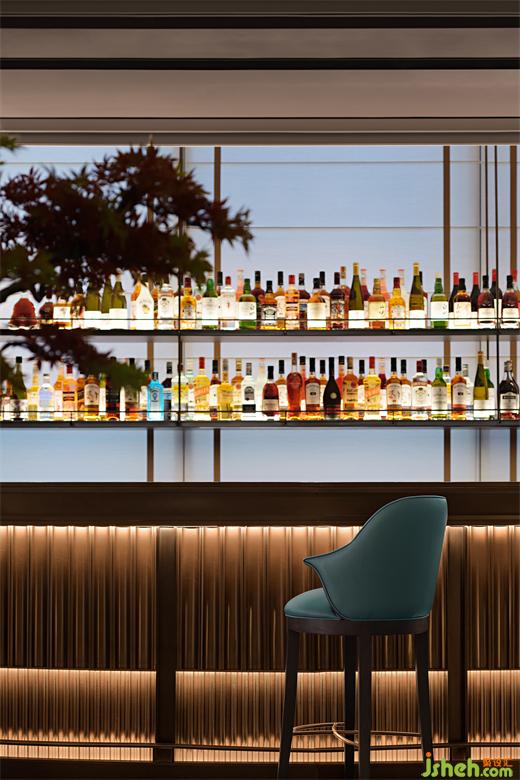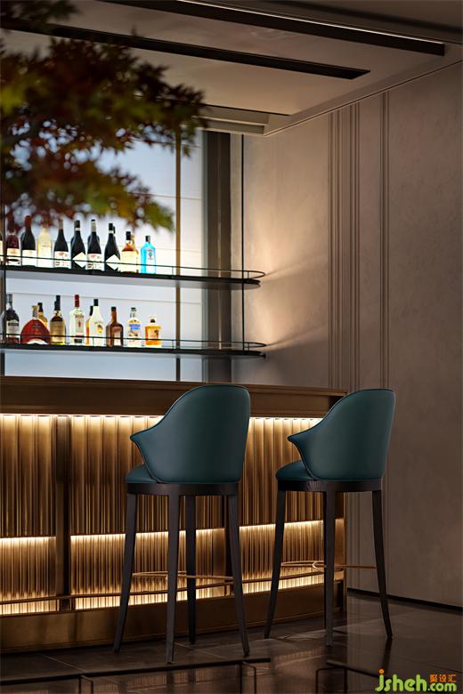 蘊(yùn)五光幽微,著十色陸離。柔光燈帶暗藏于吧臺(tái)內(nèi)緣,光被柜面的起伏花紋蕩起褶皺,細(xì)碎鋪灑在吧臺(tái)表面。設(shè)計(jì)師擅于以明暗劃分層次、用光影渲染意境,錯(cuò)落有致的各色酒品在展示酒柜底部散發(fā)的光暈中蒙絡(luò)一層夢(mèng)幻,光色朦朧,虛實(shí)交映,空庭即是花庭,實(shí)境即是詩境。