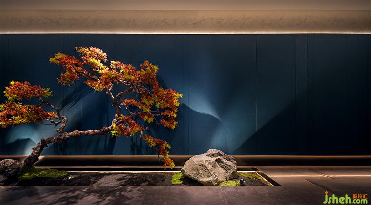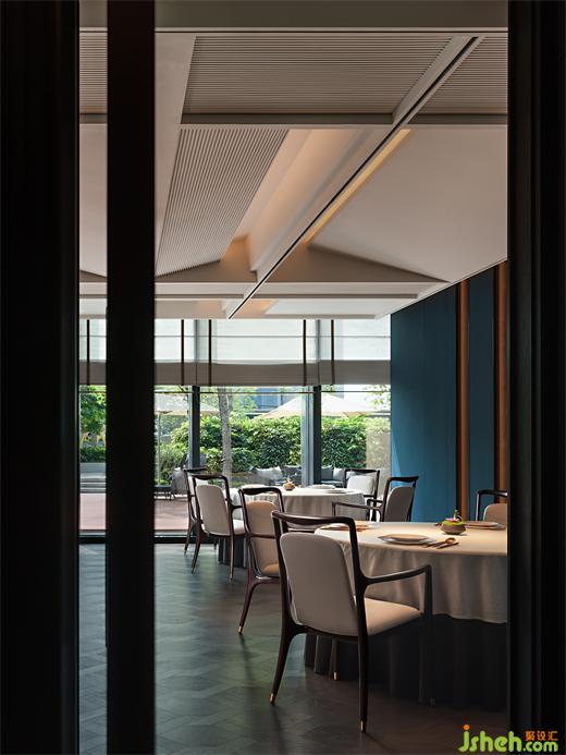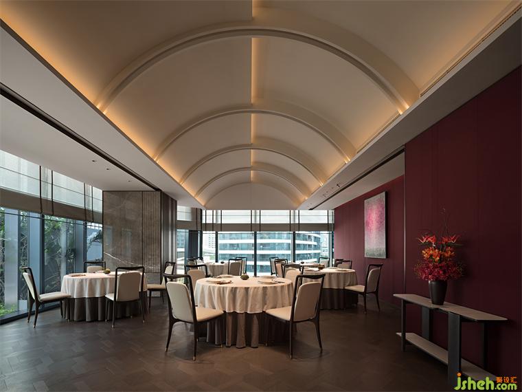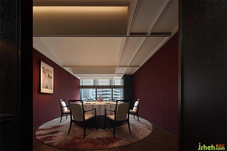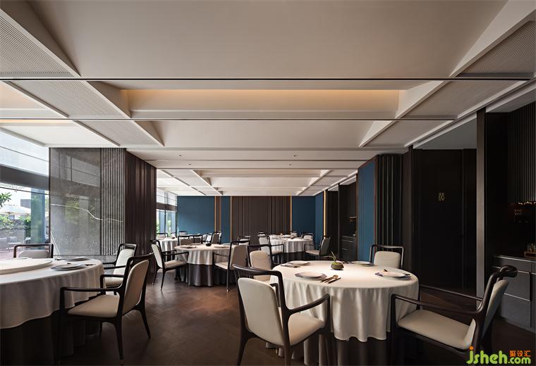 “江南好,風(fēng)景舊曾諳,日出江花紅勝火,春來江水綠如藍(lán)……”如若以色彩描繪江南、以物象詮釋江南,那么朝暉的紅、荻花的白、藍(lán)草的靛便是江南丹青中不可或缺的元素。設(shè)計(jì)師匯集水墨畫作中經(jīng)典的黛青、素白、墨灰、赤金……多元色彩的和諧共存,餐廳設(shè)計(jì)同繪出客座空間文集雅宴的雋永氣度。