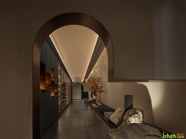 步入拱形走廊,江南滿攜煙雨氣息的風(fēng)便迎面拂來,古典園林的傳統(tǒng)造園技藝被設(shè)計(jì)師注入空間,兩端的弧形拱門展現(xiàn)出獨(dú)屬于文化古國的禮制氣派,奇崛古樸的太湖石與大型景觀相互映襯,山水之意、造園之情從枝葉石礫中自然蔓發(fā),大寫意園林的意蘊(yùn)情致自設(shè)計(jì)細(xì)節(jié)處盈盈滿溢。