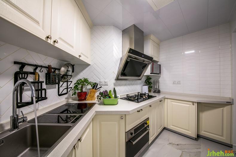 廚房為不規(guī)則空間,狹長(zhǎng)狀,設(shè)計(jì)師據(jù)其特性沿墻設(shè)計(jì)不規(guī)則櫥柜,不僅增加了收納與操作空間,連業(yè)主心心念念的大號(hào)洗碗機(jī)也毫無(wú)壓力地入住廚房。