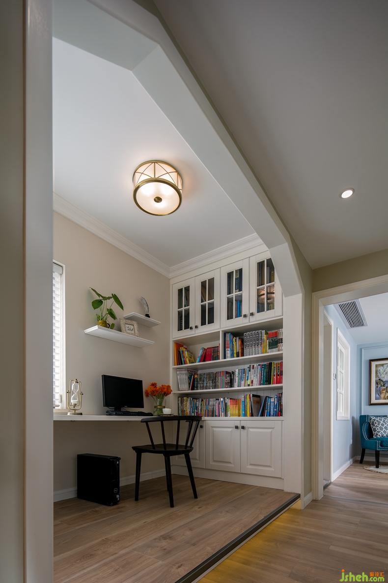 室內(nèi)設(shè)計(jì)師苦心規(guī)劃構(gòu)思,最終在過(guò)道一側(cè)設(shè)計(jì)出一個(gè)地臺(tái)式的開(kāi)放型書(shū)房,底下設(shè)有一圈燈帶,不僅豐富了空間的功能性,又增添了過(guò)道視覺(jué)美感。