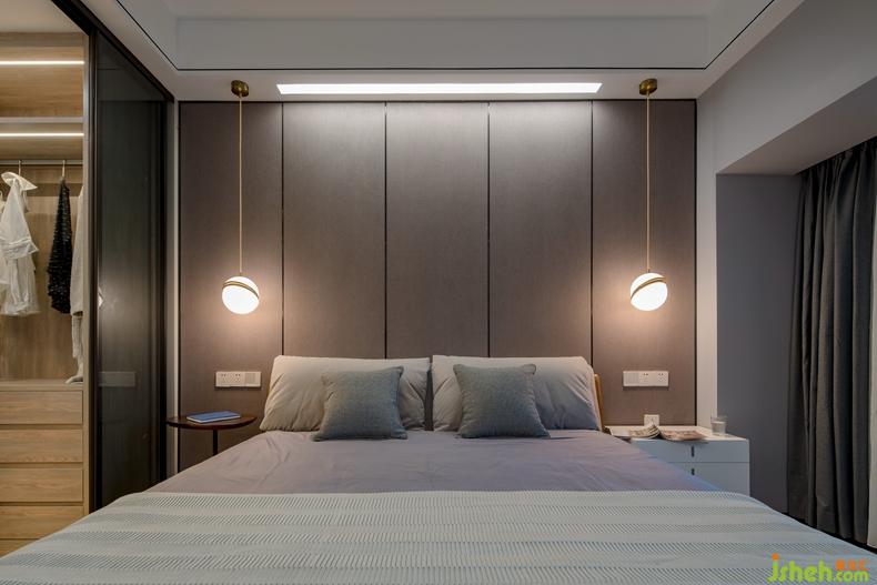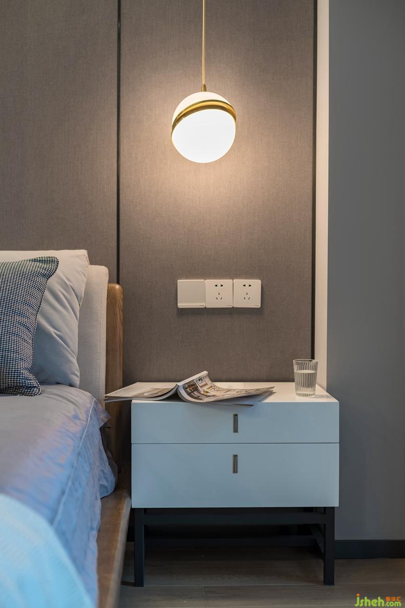 床頭硬包背景墻、吊頂,線條簡單利落,讓臥室空間令人心安放松。利用洗手間走道打造主臥衣帽間,避免了洗手間正對床頭的尷尬。選用細(xì)框玻璃門,讓臥室更加開闊。