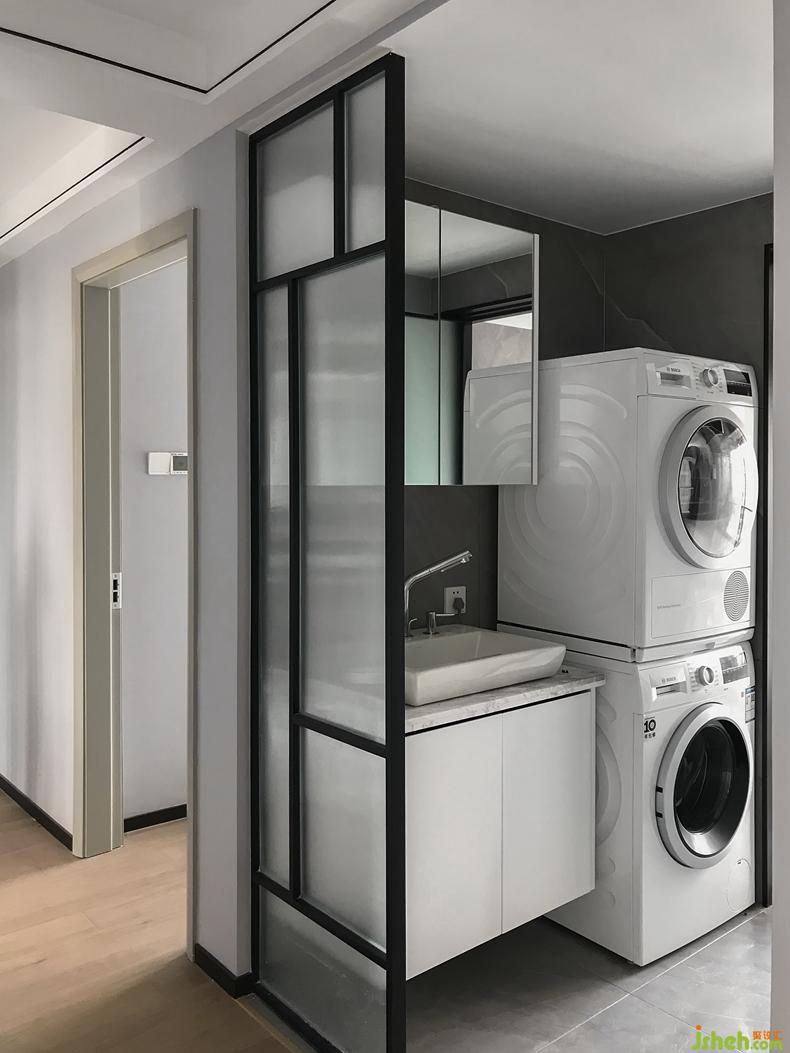 公衛(wèi)設(shè)計成干濕分區(qū),干區(qū)采用玻璃藝術(shù)隔斷,進行功能分區(qū)的同時不影響過道的采光和開闊感。將洗衣機和干衣機疊放在干區(qū),為陽臺留出足夠空間休閑。深圳設(shè)計公司