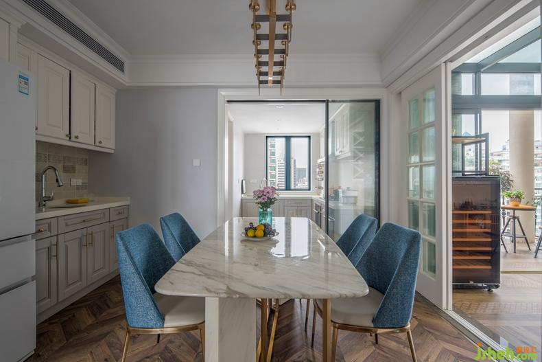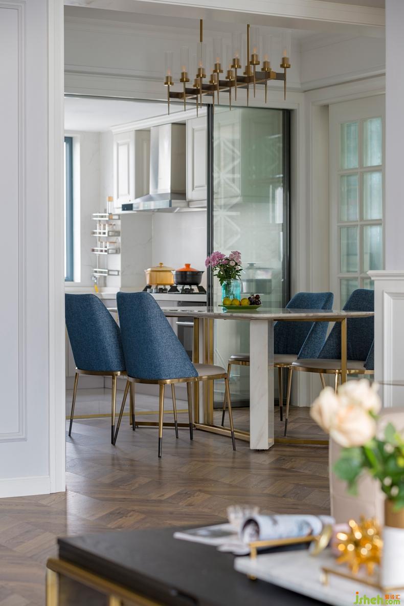 內(nèi)斂而富有質(zhì)感的藍(lán)色,配合金屬、大理石材質(zhì),低調(diào)之中質(zhì)感十足,讓吃飯變成一件優(yōu)雅的事情。
