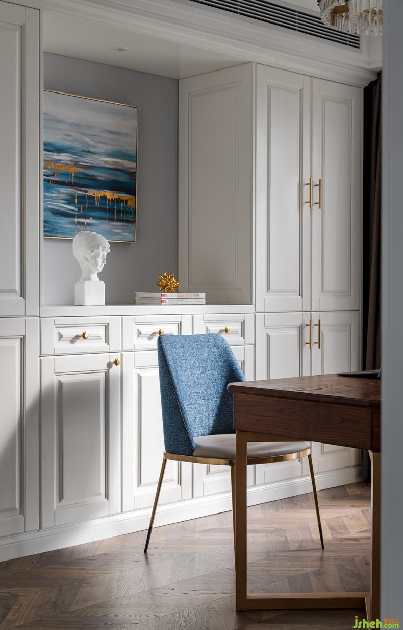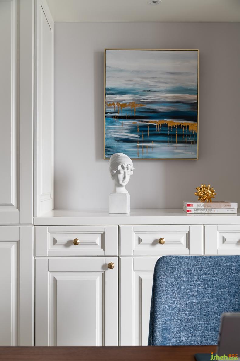 為了避免空間的沉悶感,書柜特意保留了一部分的開放區(qū)域,可以隨手擺放日常所用的小物件。配上裝飾畫、擺件,以及精致的黃銅把手,美觀又具有實用性。