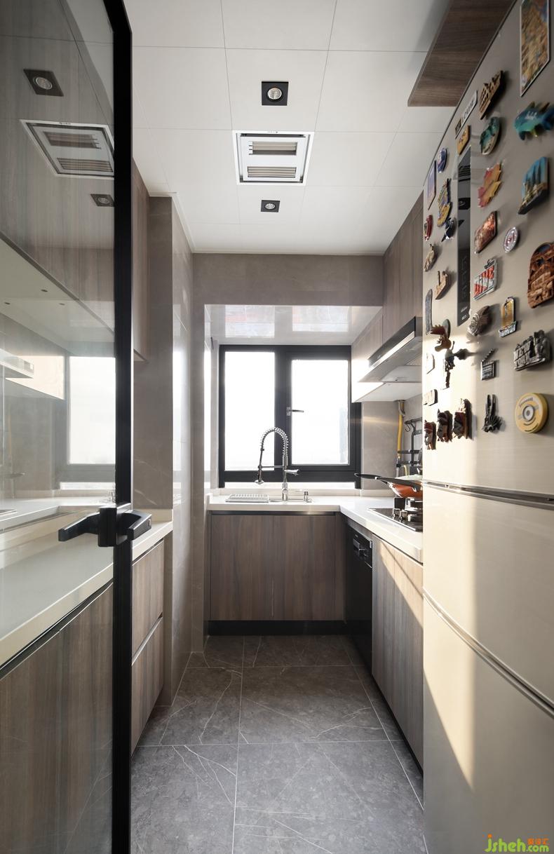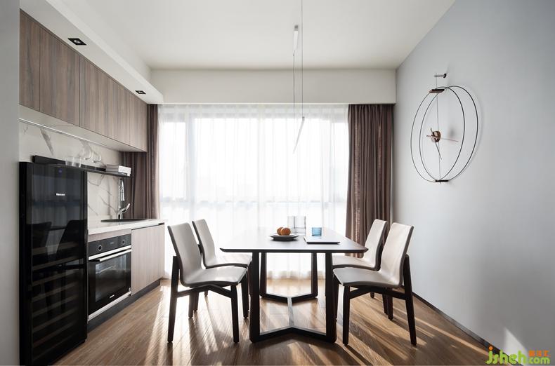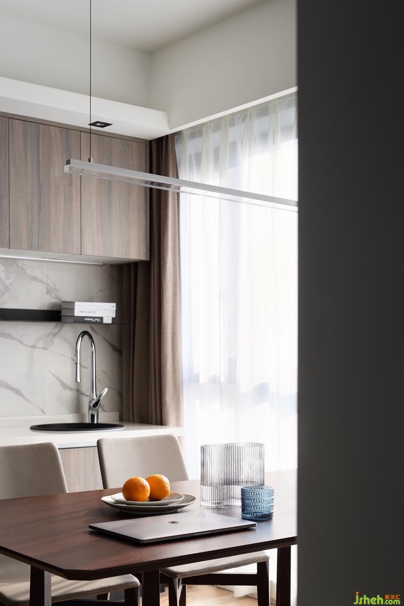 △西廚的櫥柜上不僅配有水龍頭,還有擱板、隱形燈帶,從便利的角度出發(fā),全方面的照顧到生活習(xí)慣。特地選擇與餐邊柜色彩相近的餐桌,這樣可以形成視覺上的統(tǒng)一。