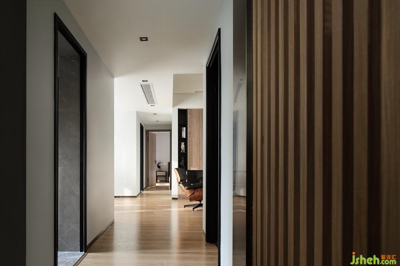 △過道過于狹長(zhǎng),干凈的布局可以讓走道更為寬敞明亮。在走道起點(diǎn)設(shè)計(jì)木格柵,豐富走道的藝術(shù)效果。