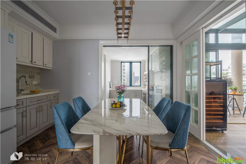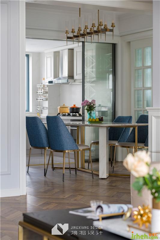 內(nèi)斂而富有質(zhì)感的藍(lán)色,配合金屬、大理石材質(zhì),低調(diào)之中質(zhì)感十足,讓吃飯變成一件優(yōu)雅的事情。