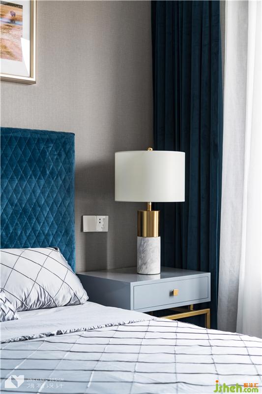 次臥以低飽和度的墻色,配合輕奢風絲絨床頭,質(zhì)感非常出眾。黃銅、大理石材質(zhì)的軟裝,配上舒適柔軟的床品,邀請人融入這舒適雅致的氛圍里。