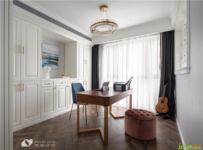 書房有著開闊的布局和充沛的光線,沒有多余的裝飾,一張桌、一把椅、一把吉他,便是最放松的所在。一整面儲物柜,足以收納書本、資料,還有旅行帶回來的紀念品。