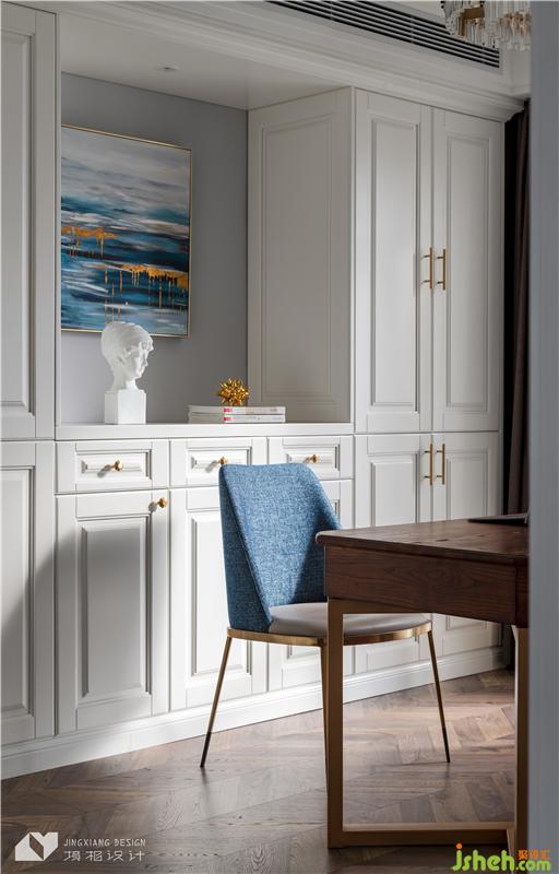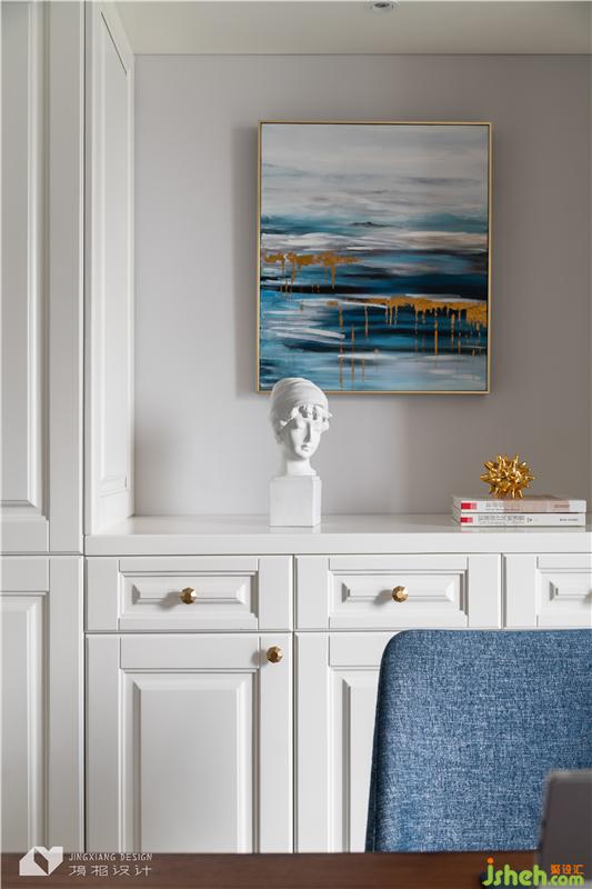為了避免空間的沉悶感,書柜特意保留了一部分的開放區(qū)域,可以隨手擺放日常所用的小物件。配上裝飾畫、擺件,以及精致的黃銅把手,美觀又具有實用性。室內(nèi)設(shè)計師