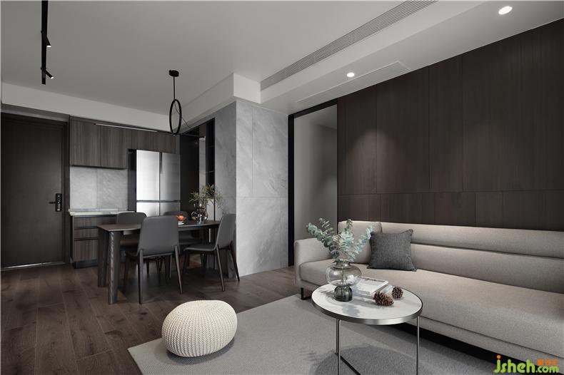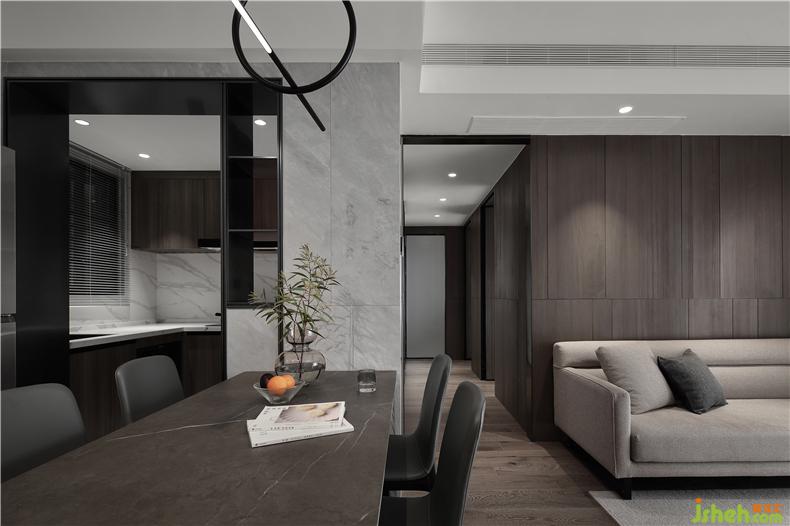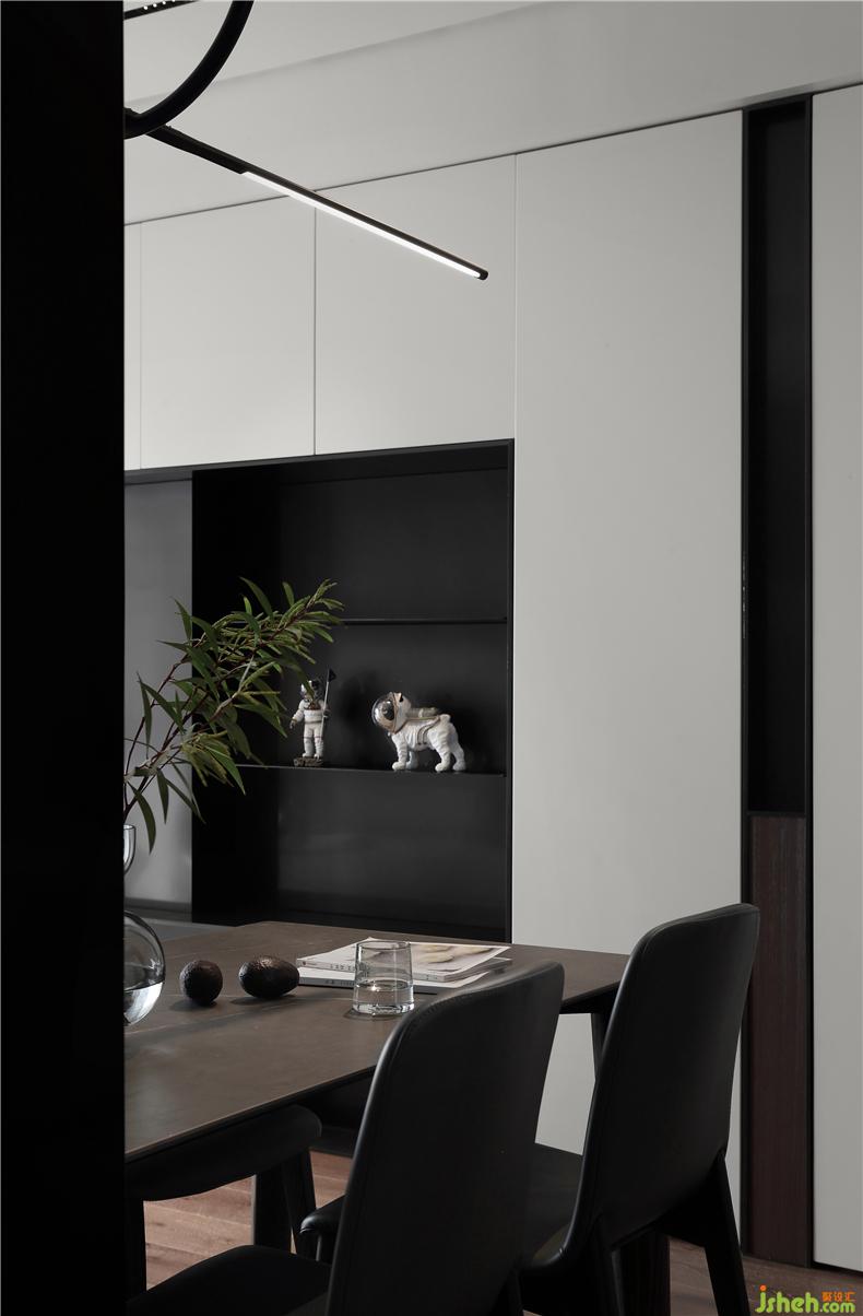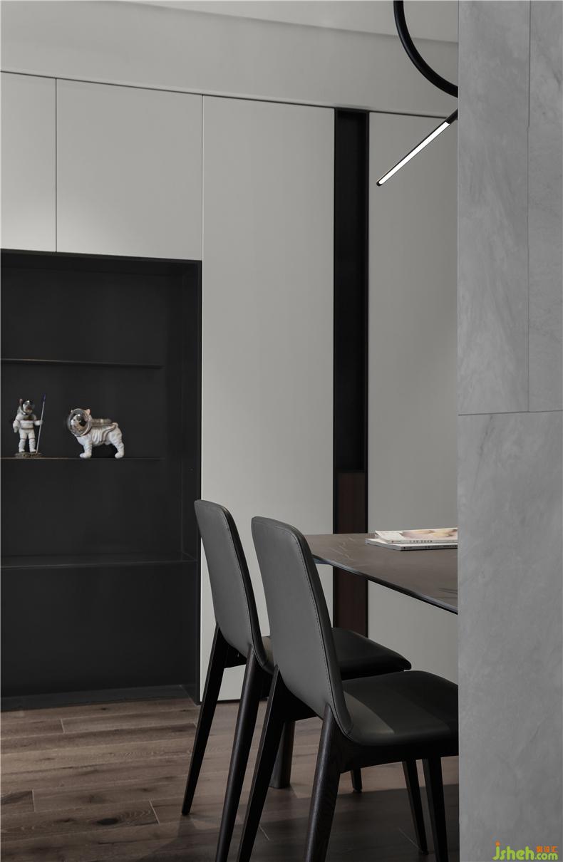 軟裝也遵循客廳的色彩,以黑色與灰色為主,讓不同材質來突出空間氣質,從而與客廳相融合。