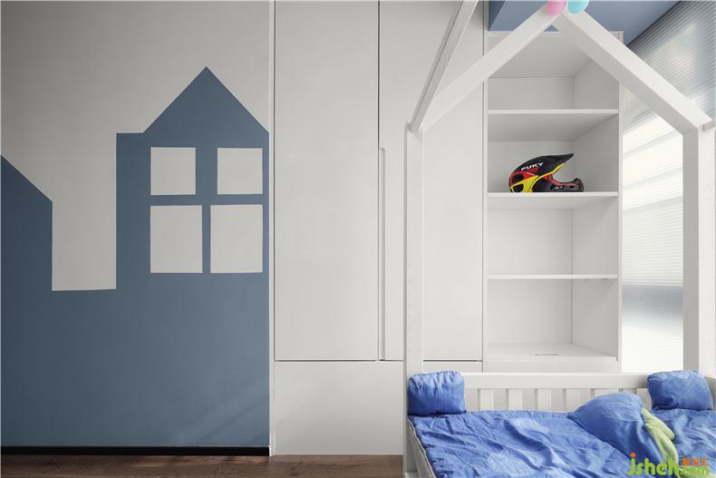 衣柜大半還是用于兒童房,于是在柜面上刻畫出藍(lán)色的房子,與墻體、床架剛好形成呼應(yīng)。角落的開放式儲物格是多功能收納,既可以放玩具衣服,也可以當(dāng)做書架。