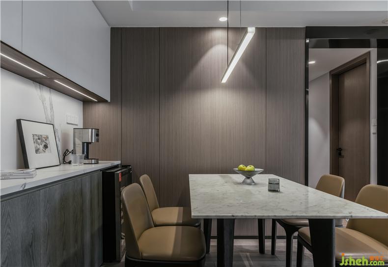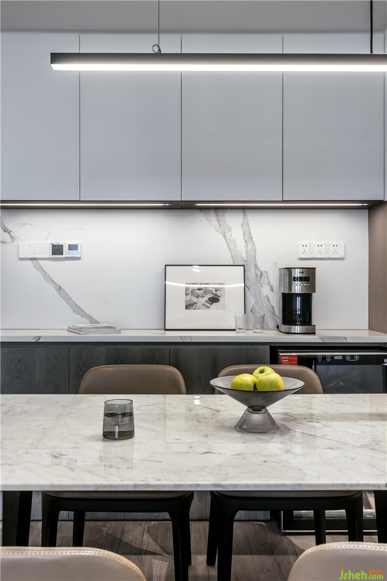 女主人想要的客餐廳一體可以輕松呈現(xiàn)!以簡(jiǎn)潔干凈為主的空間基調(diào),室內(nèi)設(shè)計(jì)師皮質(zhì)、大理石、木質(zhì)等材質(zhì)的搭配經(jīng)過(guò)精妙的設(shè)計(jì),便于日常的打理,也能融入空間,成就空間。西廚臺(tái)面選用巖板材質(zhì),與墻磚形成呼應(yīng)。西廚角落放置的還有恒溫酒柜,這讓工作壓力較大的屋主二人偶爾可以放松一下,調(diào)節(jié)整理自己的情緒。為了營(yíng)造輕盈感,所以餐桌椅都是細(xì)腿家具。橫平豎直的線條打造出立體感,光影透過(guò)其中,就連空氣都通透起來(lái)