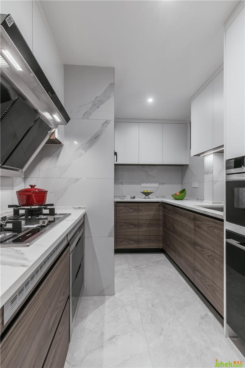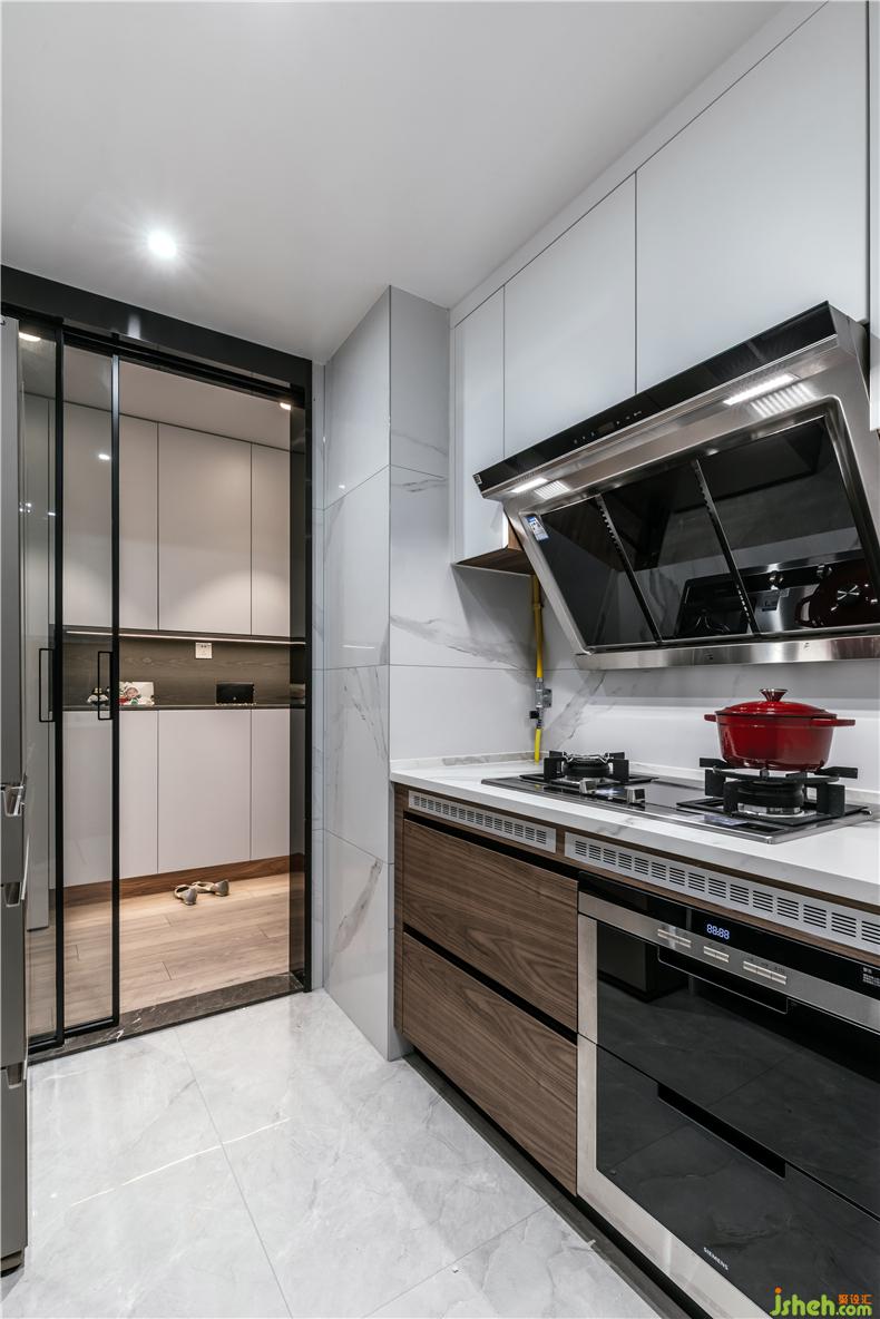 陽(yáng)臺(tái)并入后顯得廚房格外敞亮寬闊,采用大磚鋪貼墻面地面,室內(nèi)設(shè)計(jì)師視覺(jué)上的統(tǒng)一讓這種整體性更進(jìn)一步。各種家用電器都可以輕松容納,柜子也非常多,讓喜歡烹飪的女主人更加喜愛(ài)這片空間