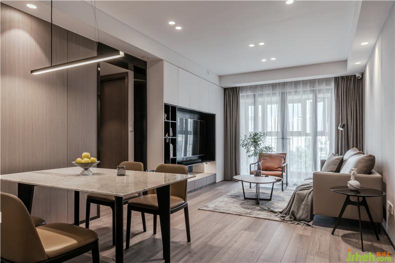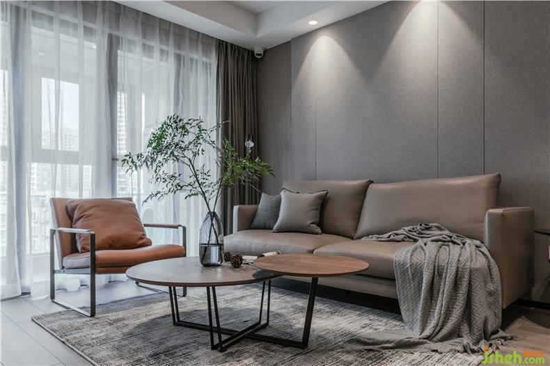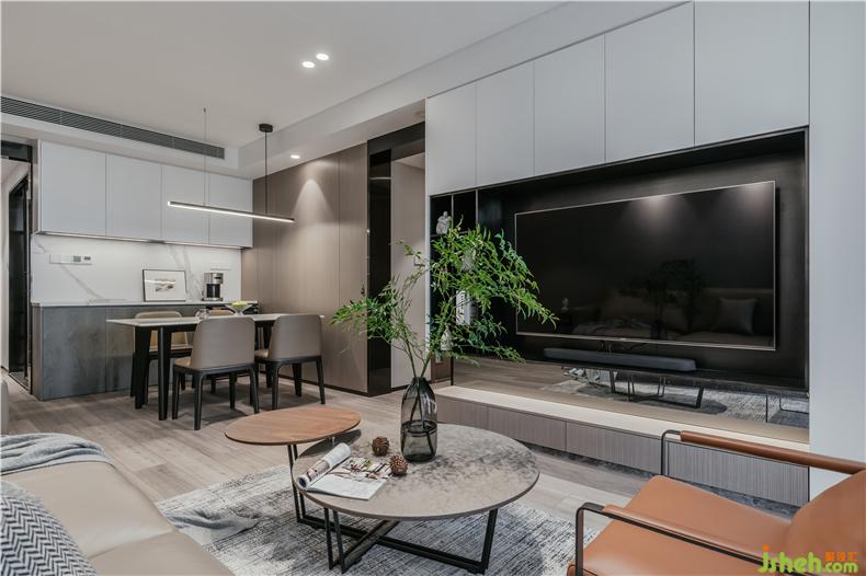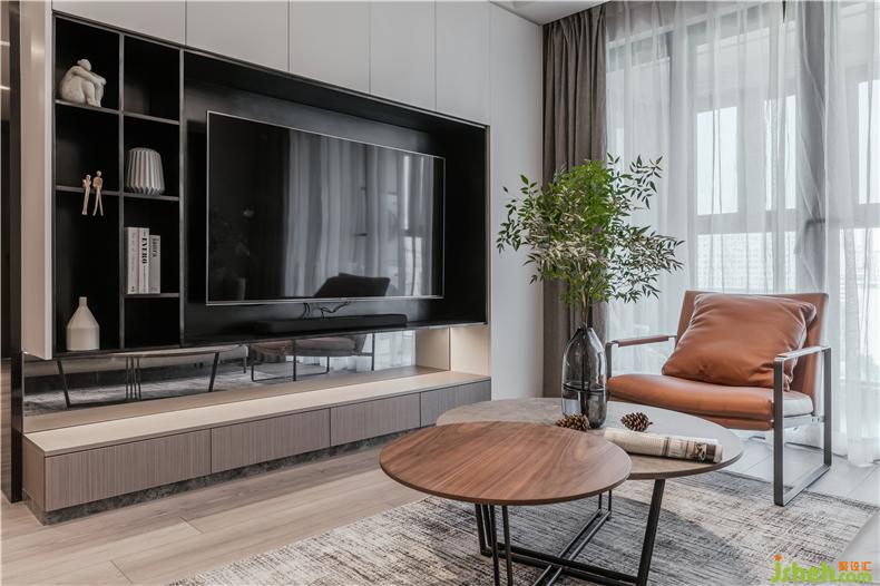 為了減輕客廳的視覺壓力,所以沙發(fā)背景墻采用灰色的飾面板。室內(nèi)設(shè)計(jì)師搭配皮質(zhì)的咖色沙發(fā)與橙色單人沙發(fā),透出都市精英的沉穩(wěn)氣息。用整墻的儲(chǔ)物柜來做電視柜,既能充分儲(chǔ)物,又可以起到裝飾作用??紤]到客廳面積,沒有制作把手,按壓式回彈器讓柜子更加干凈整潔