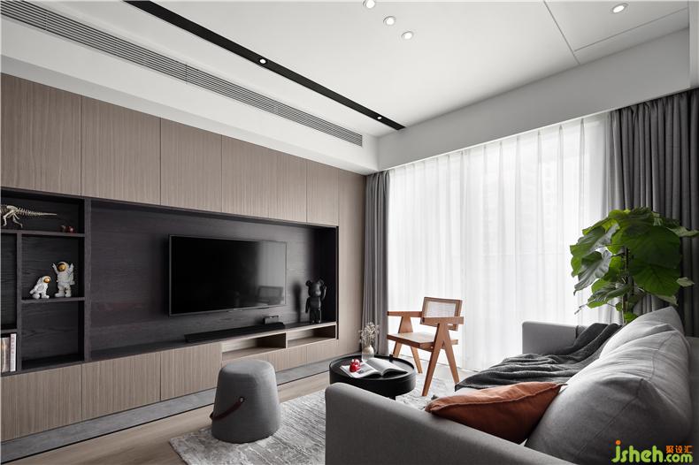 電視背景墻利用不同深淺的木色交錯來凸顯出空間層次,室內(nèi)設(shè)計師減少視覺疲勞感,封閉和開放式相結(jié)合的設(shè)計,滿足女屋主的儲物和男屋主的展示需求。只要設(shè)計得當(dāng),客廳自然能將美觀性和實用性都兼顧。