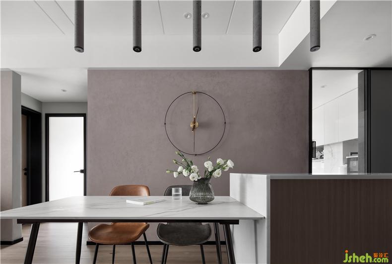 以極簡掛鐘為裝飾,餐廳背景墻的設(shè)計清爽自然,保證了客餐廳基調(diào)的統(tǒng)一。室內(nèi)設(shè)計師頂部安裝了線性吊燈,補充了餐廳的縱向?qū)哟胃?,同時讓空間更有格調(diào)
