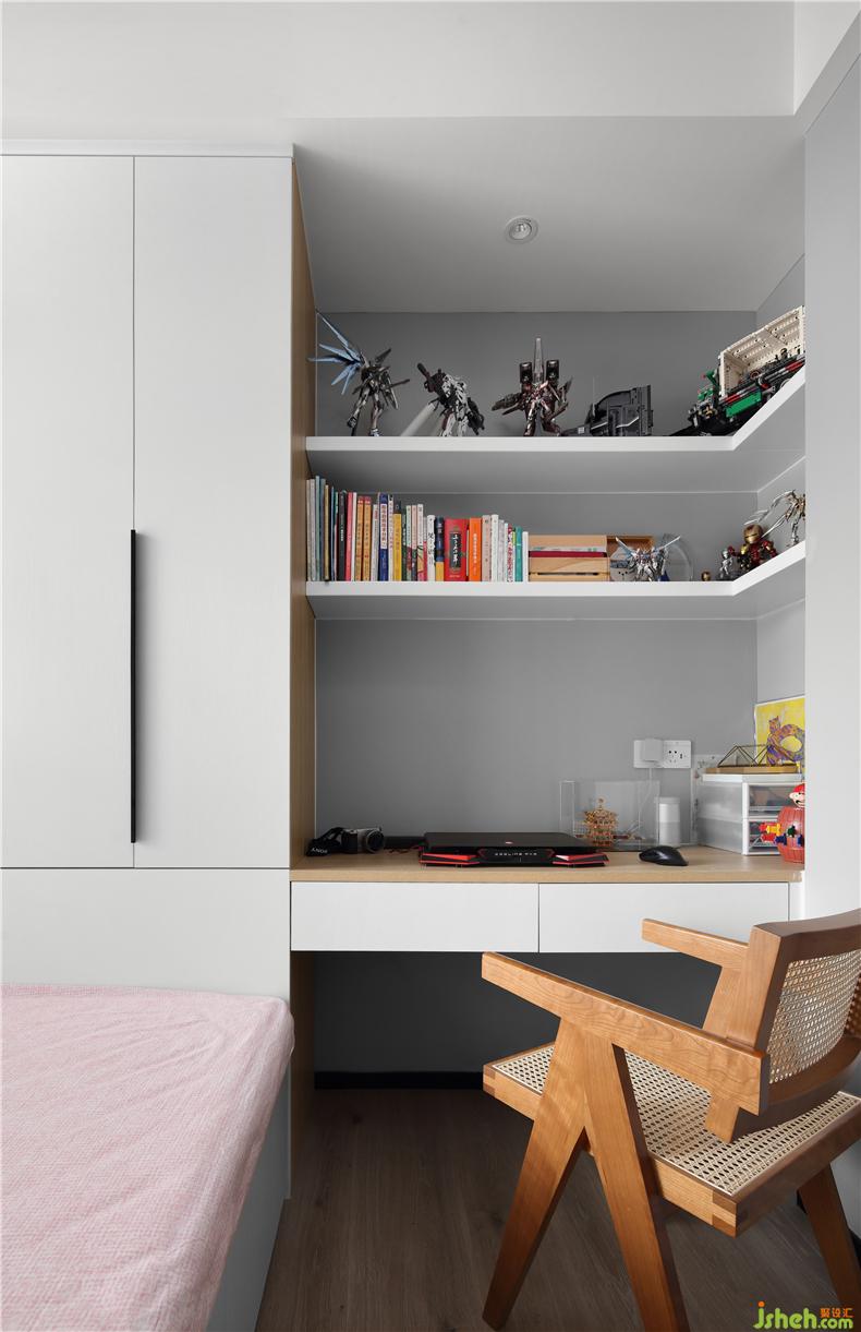 房間制作了榻榻米,并且與書桌一體設(shè)計,室內(nèi)設(shè)計師充分利用空間的同時也提供了大量的儲物空間,白色的柜體干凈利落,視覺上也更加輕盈。配上一把木質(zhì)編藤椅,無論是辦公還是休息,都非常舒適~