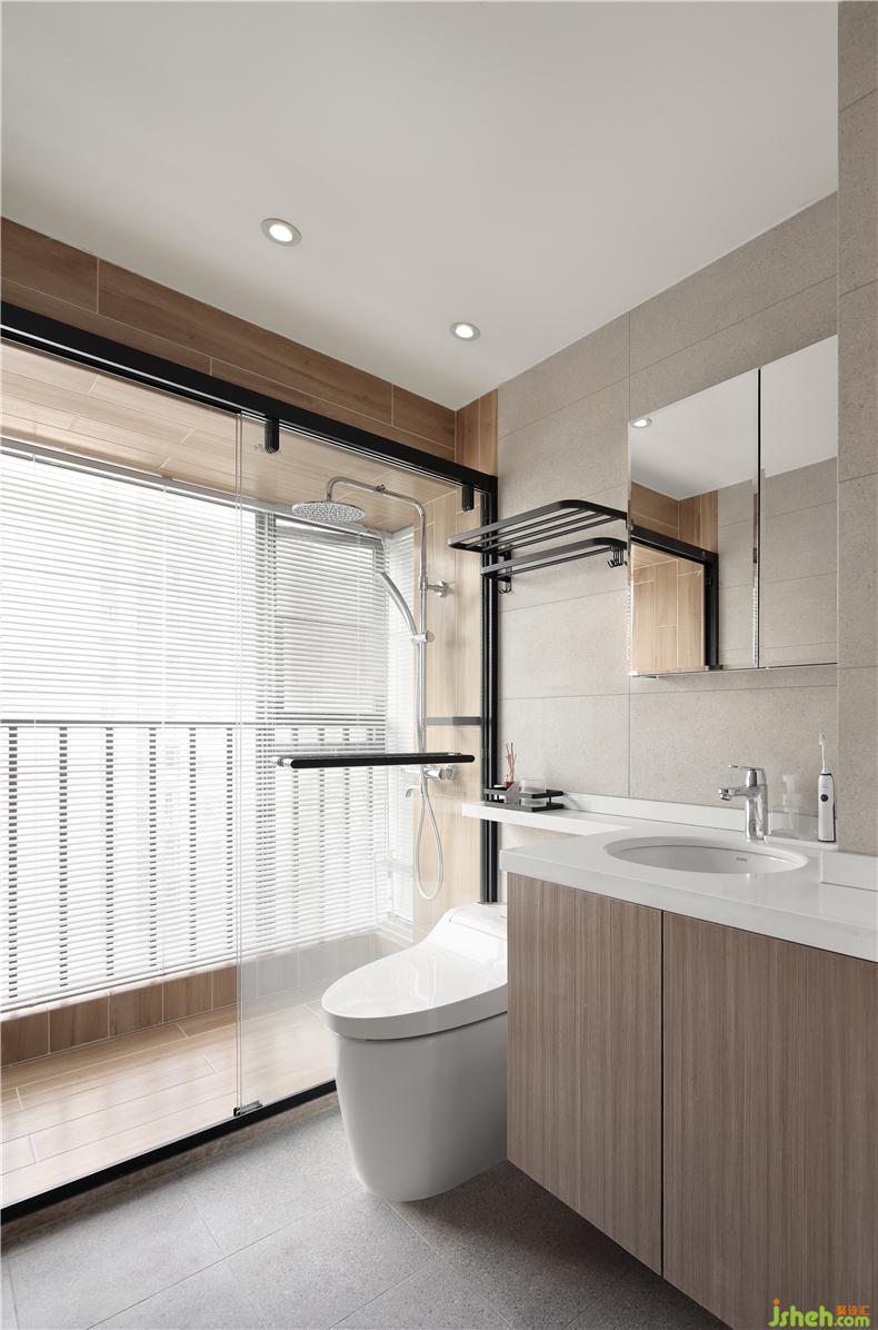 衛(wèi)生間設(shè)計干濕分區(qū),濕區(qū)鋪設(shè)別致的木色瓷磚,室內(nèi)設(shè)計師連同墻面和頂面都做了材質(zhì)的統(tǒng)一,小空間也能設(shè)計感滿滿~