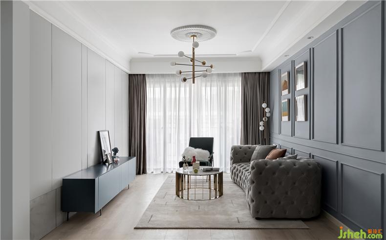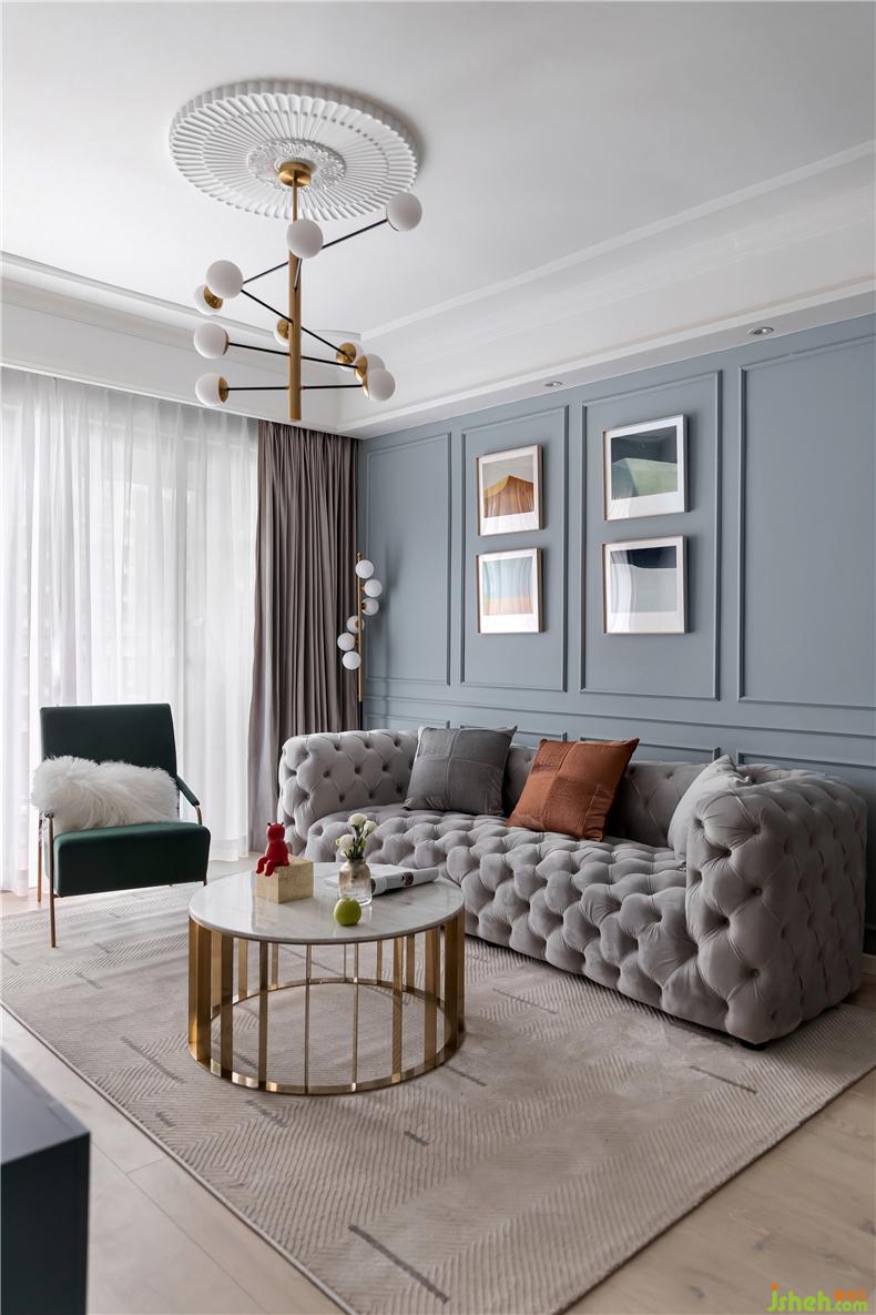 灰藍(lán)色的沙發(fā)背景,調(diào)性低奢細(xì)節(jié)豐盈,室內(nèi)設(shè)計師上方設(shè)計了嵌入式的筒燈,墻面來幾幅掛畫裝點,夜幕降臨華燈初上時,一個有品位的家便映入眼簾。