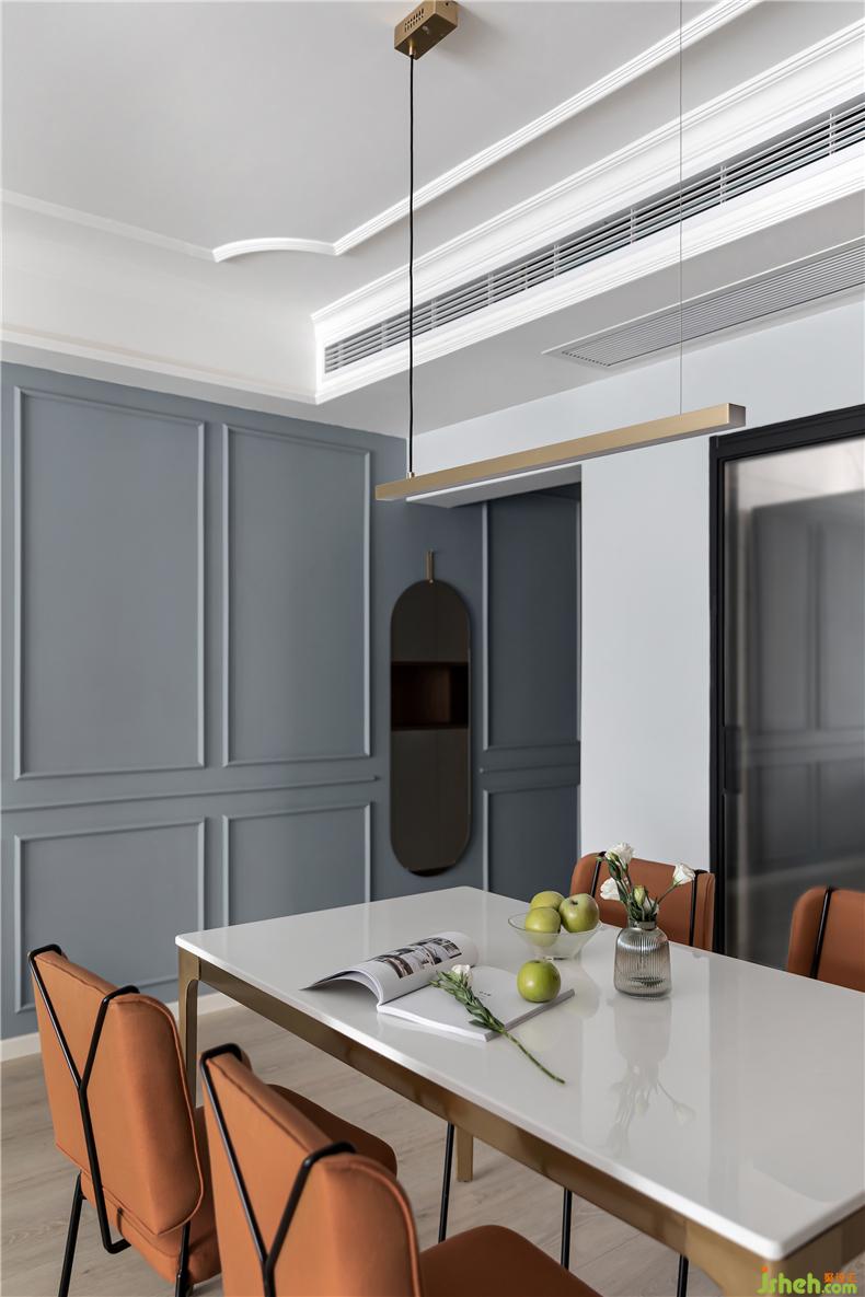 客廳的墻面設(shè)計延伸至餐廳,兩個空間的聯(lián)系更為緊密,靠近玄關(guān)過道處安放了一面穿衣鏡,方便屋主出行前整理妝發(fā),鏡身圓潤的曲線輪廓和墻面形成互補,讓過道處的視覺效果更加通透舒適。