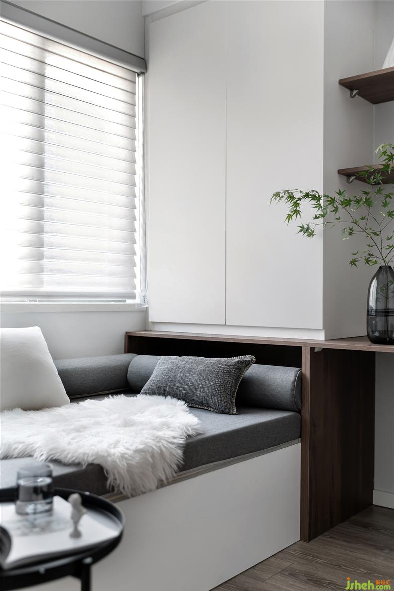 靠窗處現(xiàn)場制作了小型榻榻米,可以成為辦公疲憊時小憩的場所,另外打造了柜體,可以分擔全房的儲物壓力。