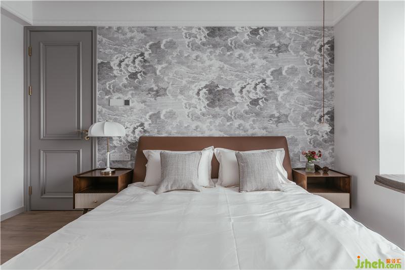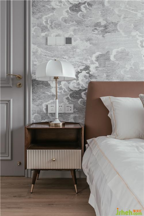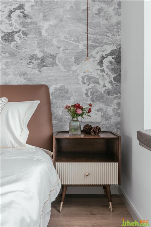 整面云朵壁畫,是空間的視覺(jué)焦點(diǎn),低飽和色系,更顯臥室的素雅,也帶來(lái)清涼的舒適感。