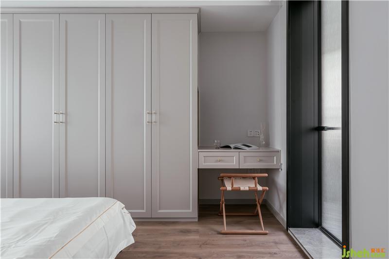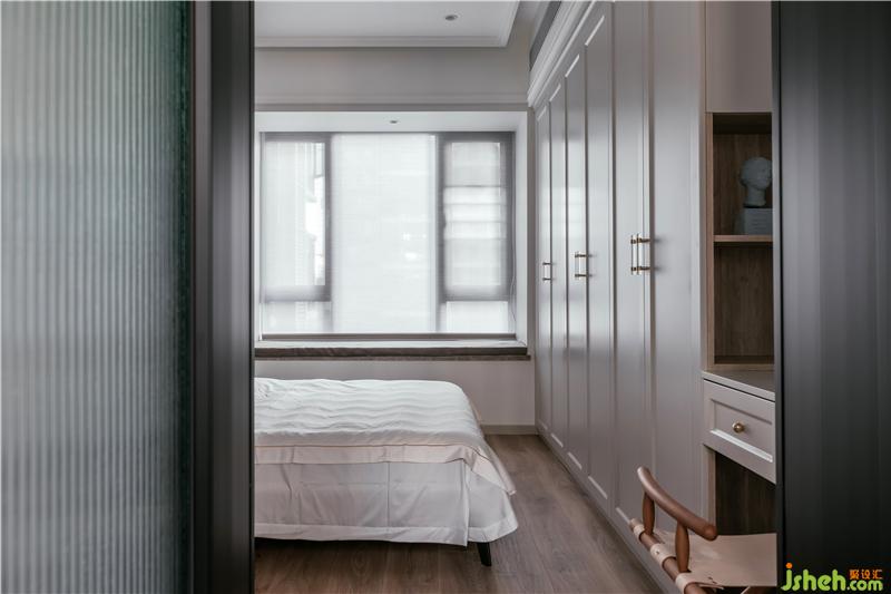 頂天立地的衣柜一氣呵成,營(yíng)造流暢的視覺(jué)效果,靠近陽(yáng)臺(tái)處設(shè)了一張懸空書桌,方便孩子晚間做功課和老人看報(bào)。