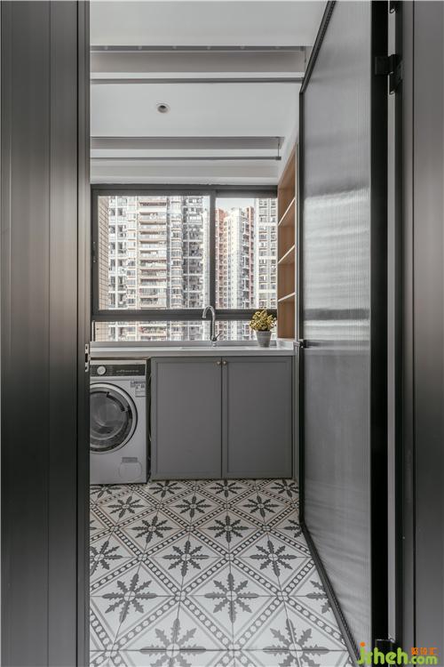 與主臥相連的陽(yáng)臺(tái),采光最好,成為家中晾曬區(qū),極窄黑框玻璃門,令光線暢通無(wú)阻,添置烘干一體機(jī),無(wú)懼南方梅雨季?;ㄉ练€(wěn)的地磚,低調(diào)而內(nèi)斂。