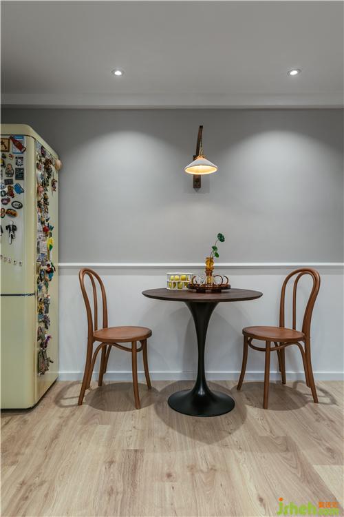 墻面以腰線分割,上半部分淺灰,下半部分純白,色彩清淺柔和卻不失層次感。
