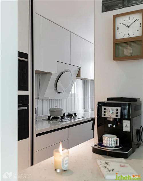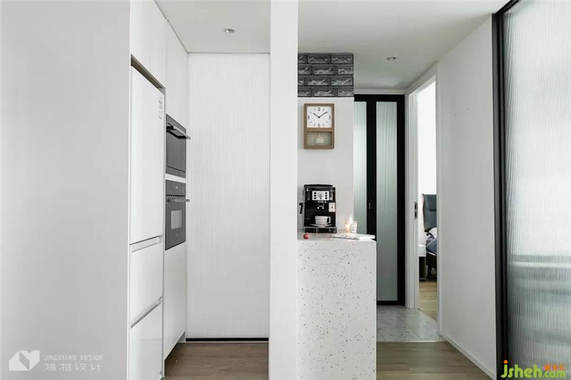 在廚房外側(cè)設(shè)計高柜,大體積的冰箱、蒸烤箱全部內(nèi)嵌,方便隨時使用。中間安裝白色移門,烹煮食物時閉合,深圳公寓裝修設(shè)計可以防止油煙外躥,同時也不影響水吧的正常使用。