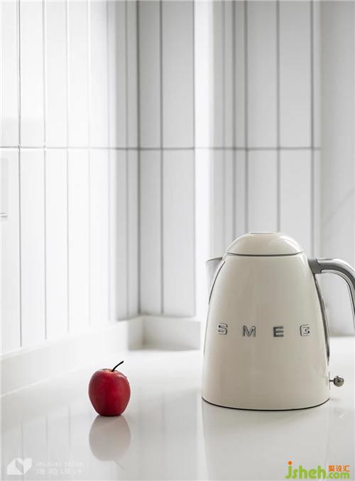 廚房以白色為主調(diào),進一步提亮空間。地柜懸空設(shè)計,削弱壓抑感。長條小白磚,線條感突出,令墻面立體而靈動,中和了純白的單調(diào)。
