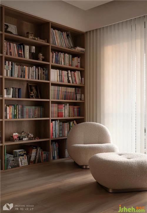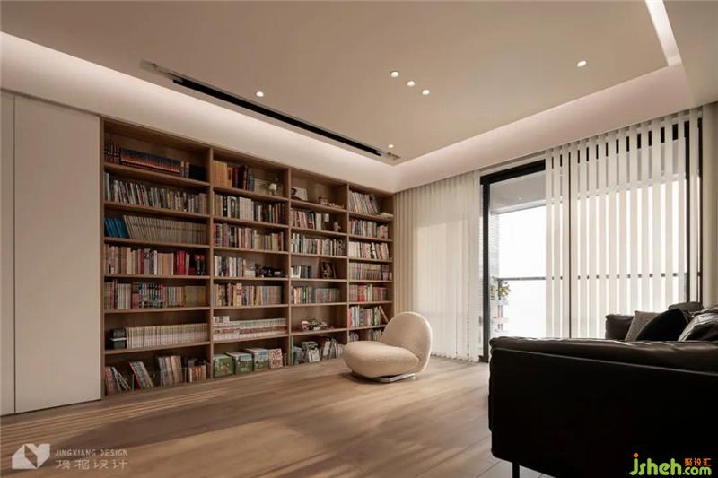 The living room is mainly white, with hidden downlights and magnetic absorption lights. It is visually open and atmospheric. The log floor quietly warms up the space, abandons the TV and designs a whole row of bookshelves. Walking into the living room is like walking into a library. Real life does not need so much gorgeous decoration, a sofa, a book, a touch of sunshine, just spend the whole day, this is the small lucky life.