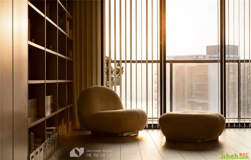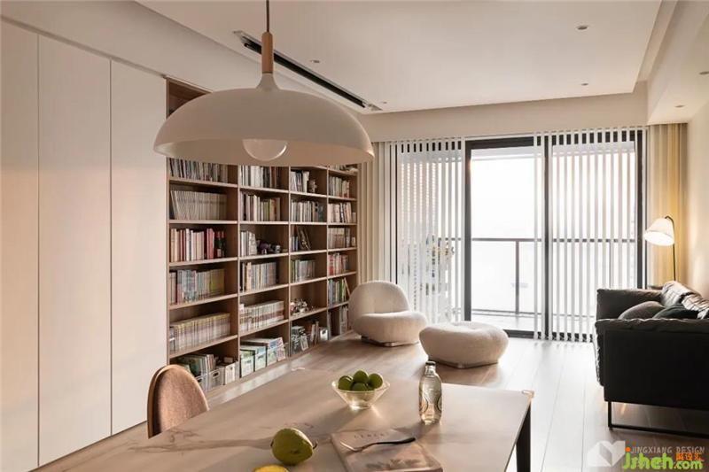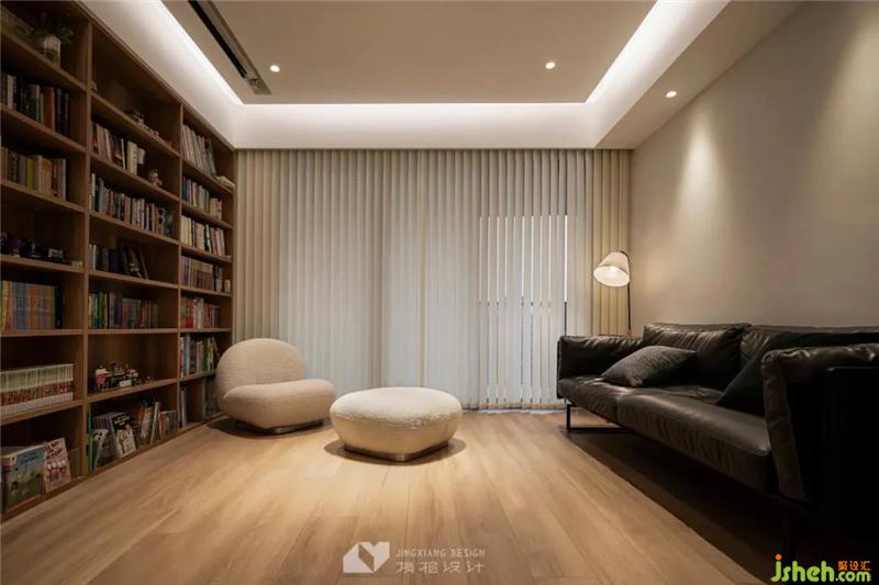 客廳以白色為主調(diào),搭配隱藏筒燈和磁吸燈,視覺上開闊大氣,原木地板為空間悄悄增溫,摒棄電視,設(shè)計(jì)整排書架,走進(jìn)客廳仿佛走進(jìn)圖書館。真實(shí)的生活并不需要那么多華麗的裝飾,一張沙發(fā),一本書,一抹陽(yáng)光,就這樣度過(guò)一整天,即是生活的小確幸。