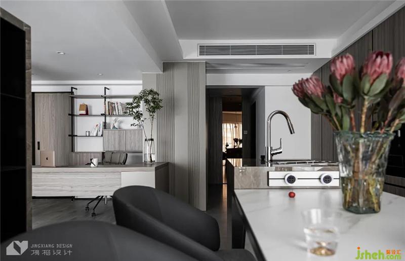 餐廳尋求色彩平衡,素凈的白色巖板搭配高級灰的皮質,一深一淺,相得益彰,空間層次分明,格調盡現(xiàn)。