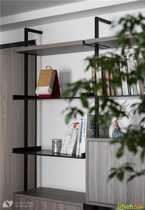 利用L型書桌,巧妙劃分出空間界線,營造書房私密感。開放式書柜,造型輕盈,與開放格局深度融合,形成整體感。