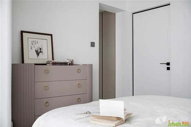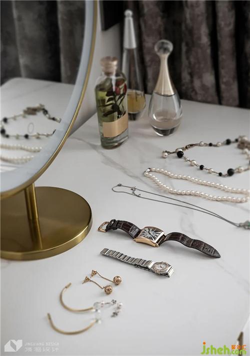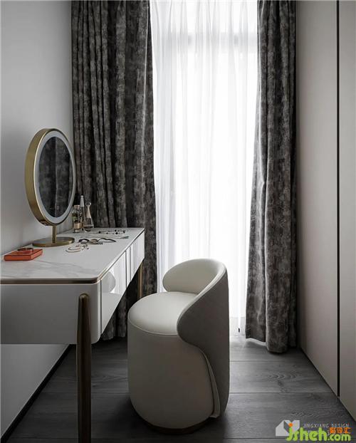 The dressing table and the cloakroom share space, expand the functional partition of the master bedroom, and upgrade the suite experience. Light luxury brass elements, out of the simple gray and white materials, adding a gorgeous texture.