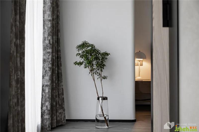 次臥延續(xù)純凈氣質(zhì),灰紋窗簾與鮮切綠植,相映成趣,令空間一角也獨(dú)具風(fēng)情,充滿雅致格調(diào)。
