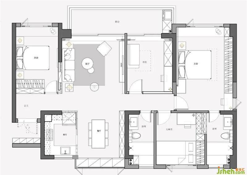 2.調(diào)換原始餐廚空間,令兩處格局更加規(guī)整,打造流暢生活動(dòng)線。